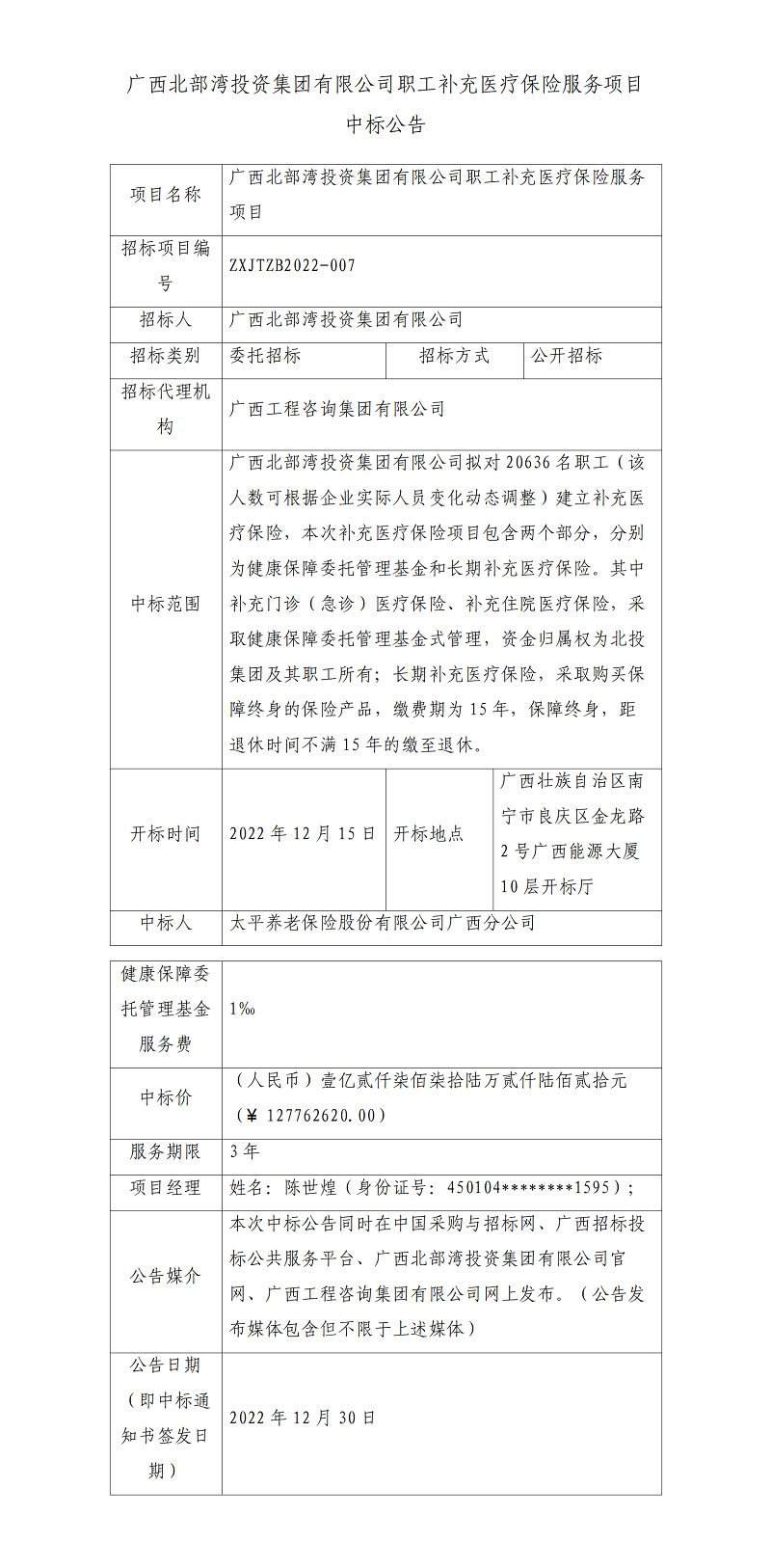 廣西北部灣投資集團有限公司職工補充醫(yī)療保險服務(wù)項目中標公告