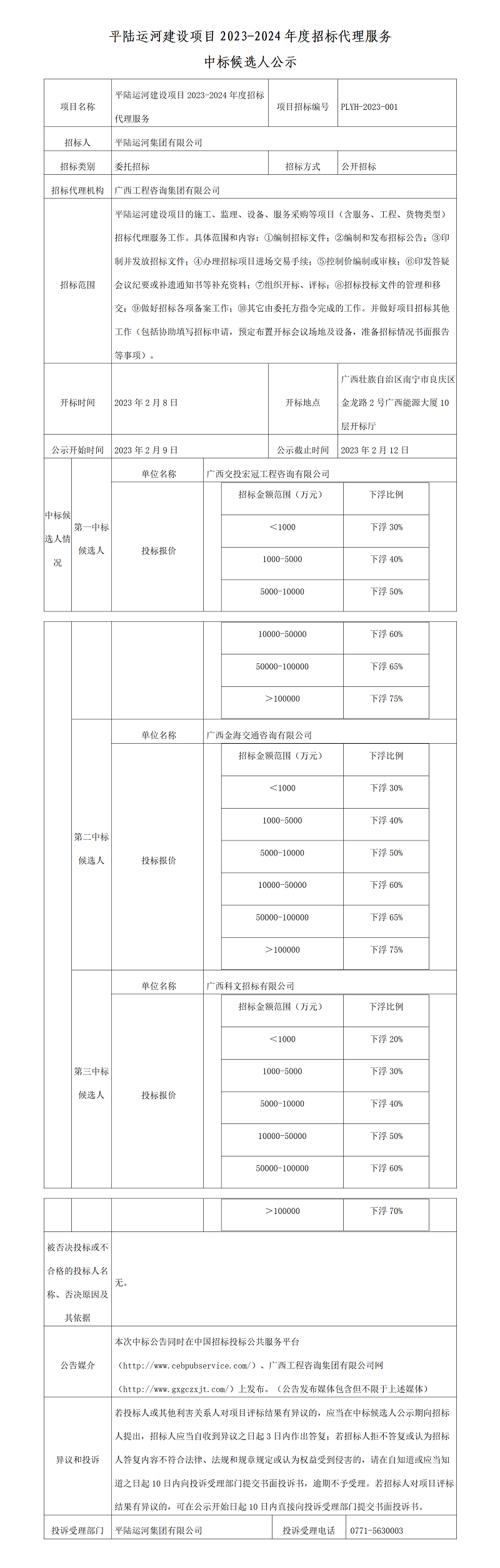 平陸運河建設項目2023-2024年度招標代理服務中標候選人公示