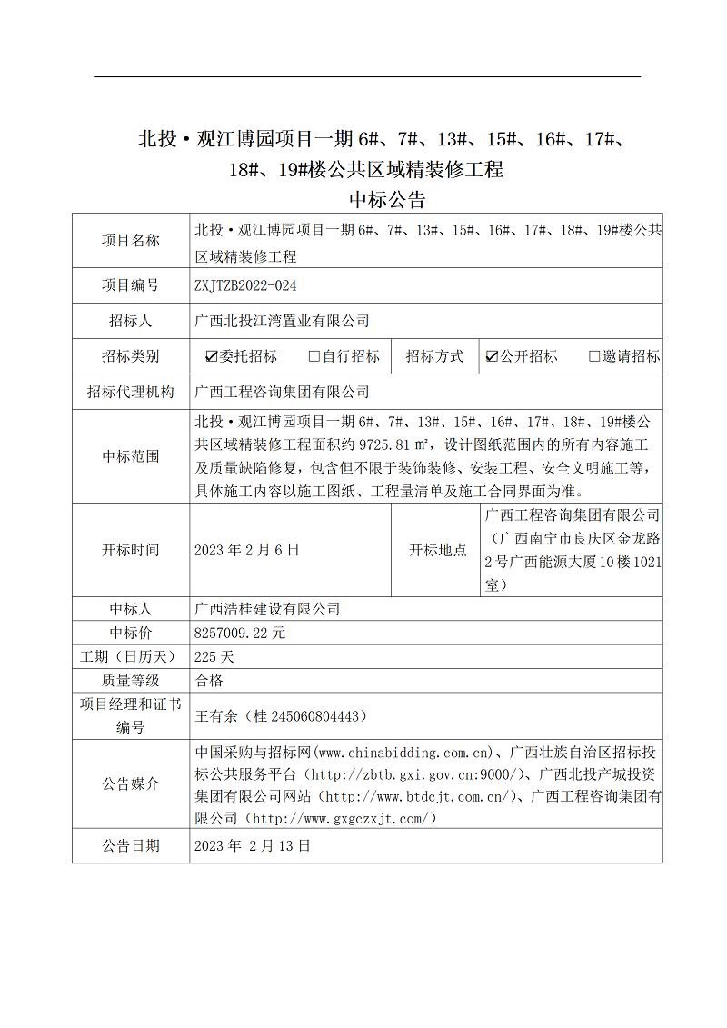 北投·觀江博園項目一期6#、7#、13#、15#、16#、17#、18#、19#樓公共區(qū)域精裝修工程中標公告