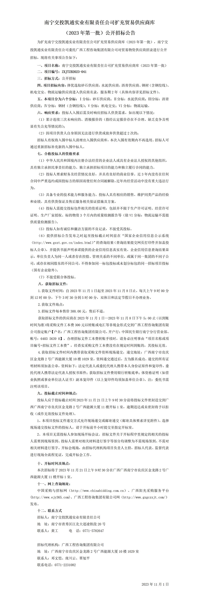 南寧交投凱通實業(yè)有限責(zé)任公司擴充貿(mào)易供應(yīng)商庫 (2023年第一批)公開招標公告