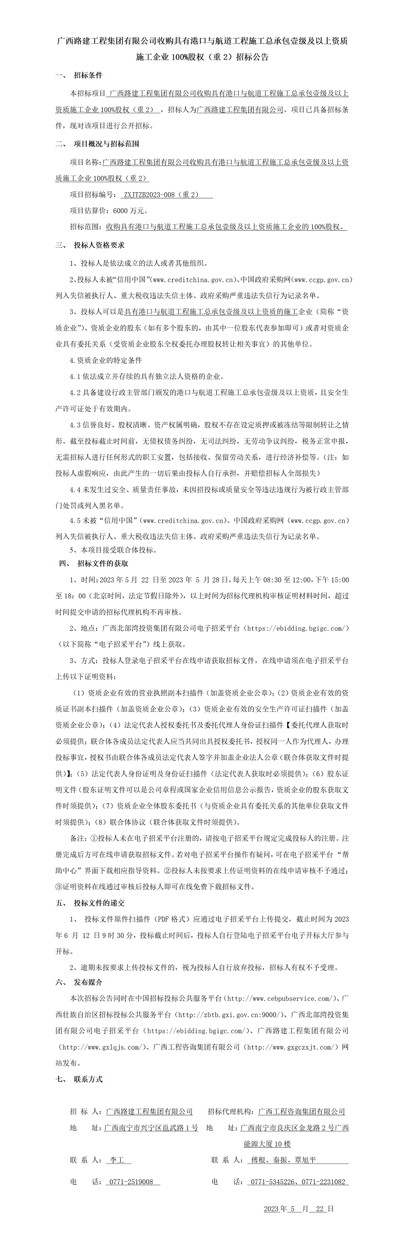 廣西路建工程集團(tuán)有限公司收購具有港口與航道工程施工總承包壹級及以上資質(zhì)施工企業(yè)100%股權(quán)(重2)招標(biāo)公告
