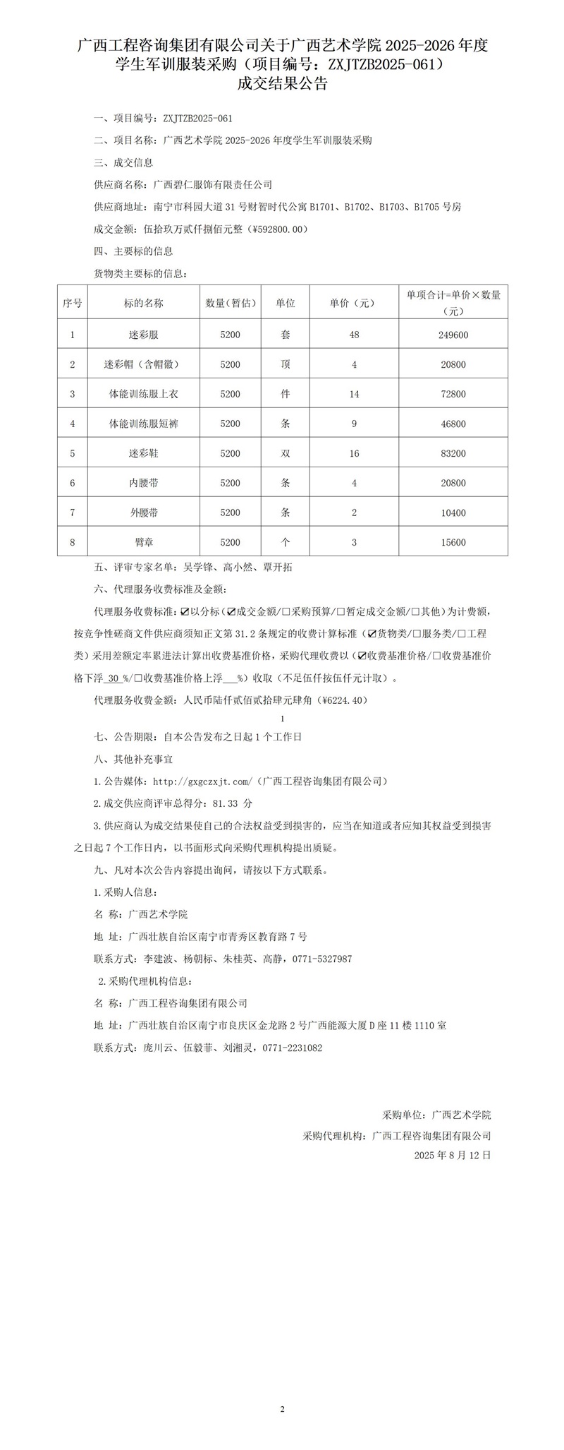 廣西工程咨詢集團(tuán)有限公司關(guān)于廣西藝術(shù)學(xué)院 2025-2026年度學(xué)生軍訓(xùn)服裝采購(gòu)(項(xiàng)目編號(hào):ZXJTZB2025-061)成交結(jié)果公告